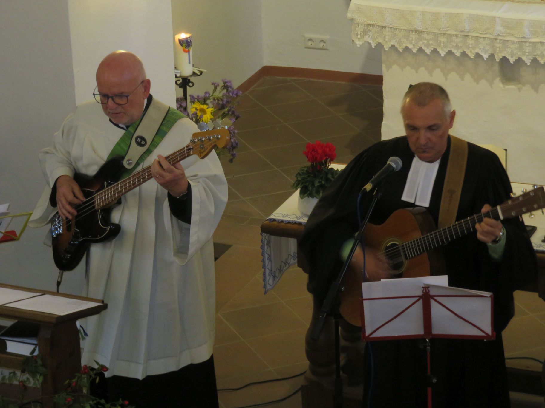 Ein ökumenischer Erntedankgottesdienst ist ja schon was Besonderes. Wenn dann aber auch noch die beiden Kirchenvertreter miteinander Kirchenmusik spielen, ist das eine Rarität die wir an diesem Tag erleben durften. Diakon Fey und Pfarrer Werner führten durch einen herrlichen Gottesdienst der mit viel Musik untermalt war. Nach einem kurzen Überblick über die Innenrenovierungsmaßnahmen und Dankesworten von Dieter Ochs-Wedertz, fand im Anschluss ein kleiner Sektempfang zur Einweihung der innen neu renovierten Kirche statt. Im Zelt war danach für Speis und Trank bestens gesorgt. Mit vielen guten Gesprächen endete ein harmonischer und wunderschöner Festtag. Wie steht an der Eingangstafel zur Kirche „… damit sie alle eins seien…“